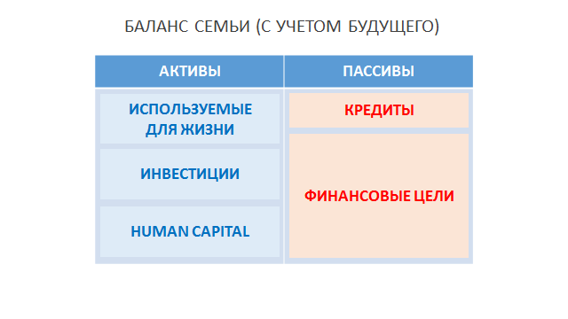 Human capital вместе с инвестиционными активами являются финансовым ресурсом, который реализует текущие и будущие финансовые цели (жизненный сценарий). Основной задачей планирования является поиск баланса между финансовыми ресурсами с одной стороны и будущими целями и текущим образом жизни с другой.