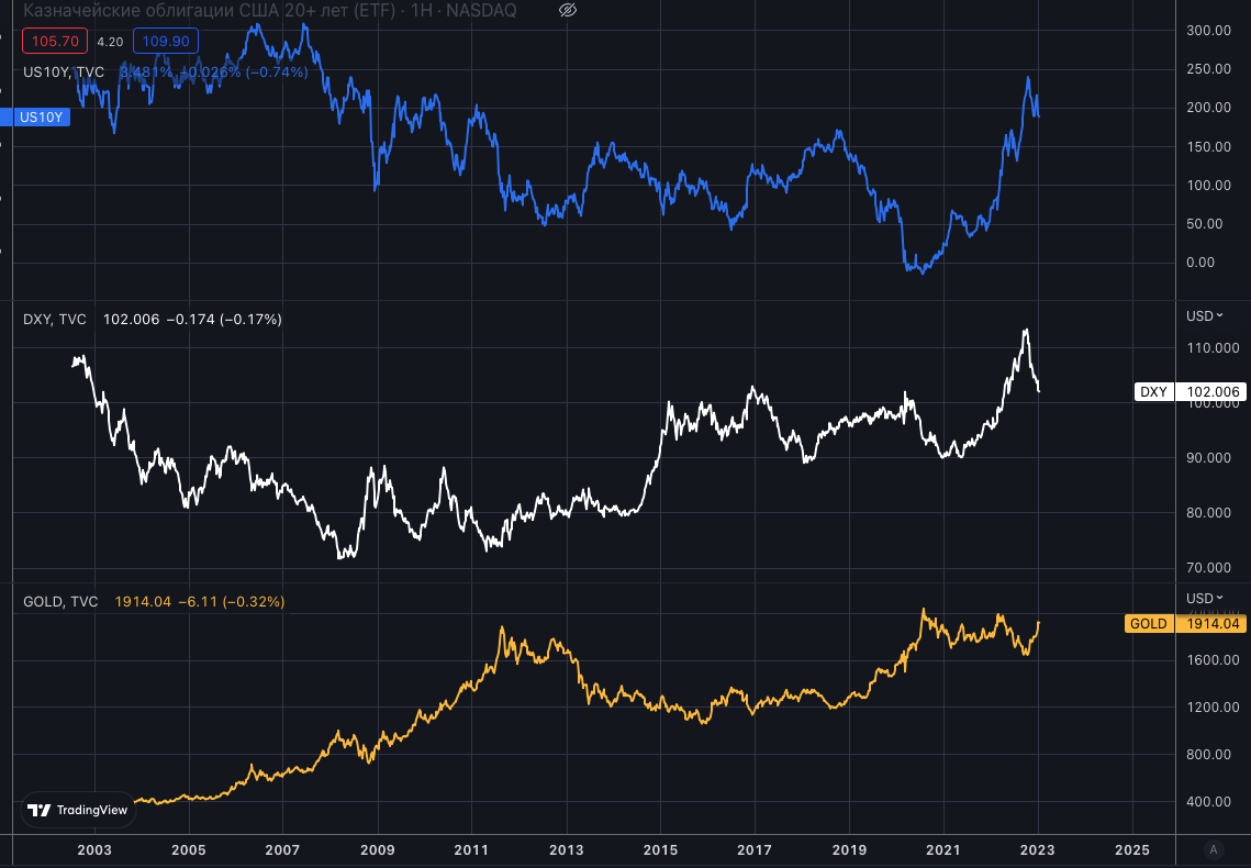 Приклад: за останній місяць індекс долара та дохідність по бондах виросли, відповідно, золото падає в ціні.