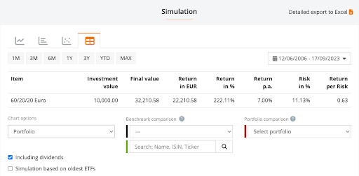 Гістограма показує, що портфель 80/20 додав 226,7% за 17 років. Початкові інвестиції в розмірі 10 000 євро перетворилися на 32 673 євро. Це на 16% вище, ніж дохідність 60/40.