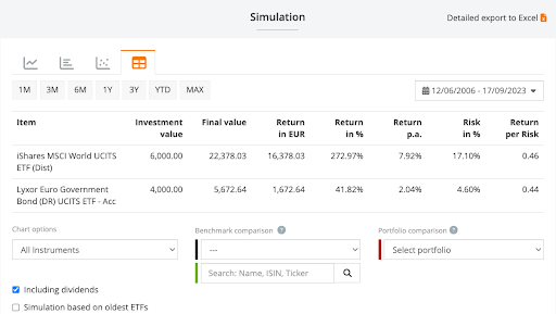 Створення портфелю багато в чому схоже на випікання торта. Ідея полягає в тому, щоб змішати різні інгредієнти ETF у правильних пропорціях. У будь-якому разі, хоча кожен торт виходить трохи по-своєму, за допомогою режиму моделювання justETF можна зрозуміти, як поводитиметься конкретний рецепт, перевіривши його минулі результати. Цей потужний інструмент дозволяє знайти будь-яку комбінацію ETF, і подивитися, чи добре вони працювали разом раніше.